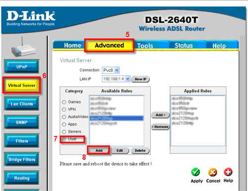 Click Virtual Server, then select the User radio button, then click the Add button.