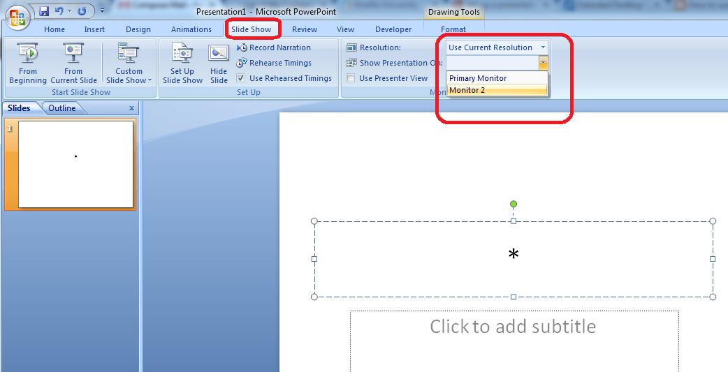 - Under Multiple monitors, in the Display slide show on: list, click the monitor you want the slide show to appear on.